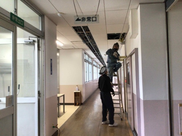 グラウンド横の枯れ枝の落下がひどいため、業者の方による樹木の伐採が始まりました。校舎内では、水道管の工事です。来年度の4月を気持ちよく迎えられる予定です。