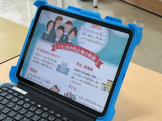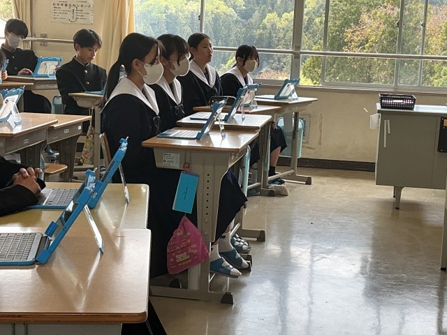 2年生教室では、いじめをしない、させないことや、SNSの正しい向き合い方について授業を行っていました。新しい学習用タブレットが配られた機会に、もう一度デジタル社会で生きる上で大切な心を育てていきます。真剣に聞き入る生徒の表情が印象的でした。