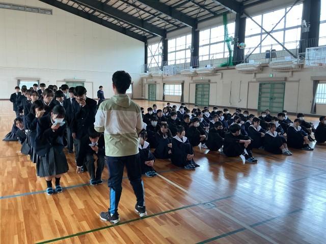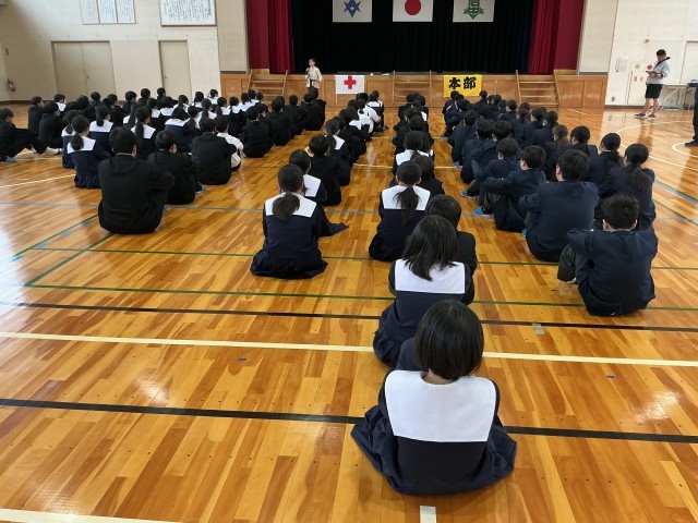 避難訓練が実施されました。当初の予定では、グラウンドへの避難を想定していました。しかし、雨天のため、急遽放送で体育館への避難に切り替わりました。このような状況でも、整然と避難をしてくる様子を見ることができました。避難経路や、万が一の時でも落ち着いた行動をとることの確認ができました。