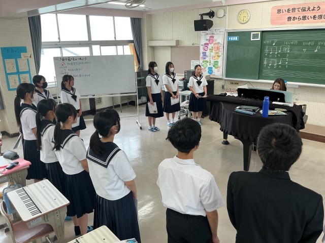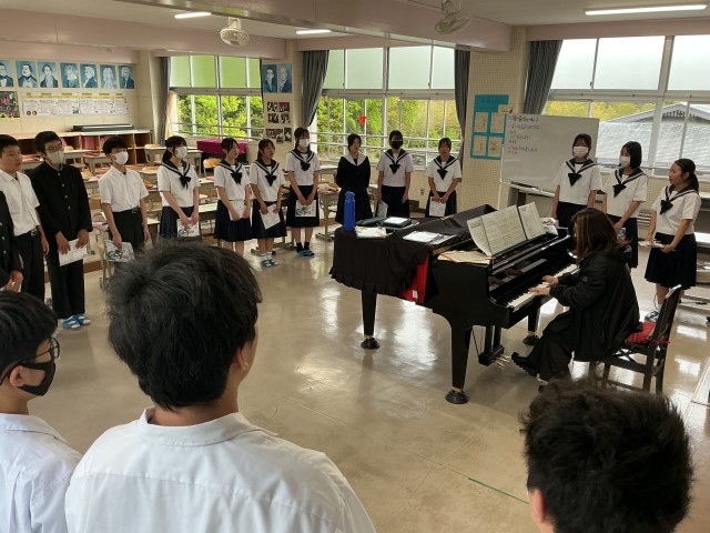 音楽室から「花」の合唱が聴こえてきました。その歌に誘われて階段を上がっていくと、曲が変わり、昨年度の卒業を祝う会で歌った曲を歌っていました。以前に歌った曲であったので声が出しやすいのか、声出しを行っていました。全力で歌う気持ちの良さを味わっていました。