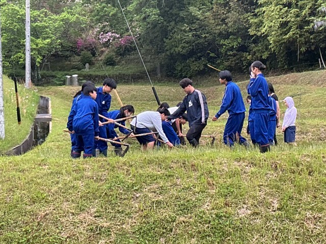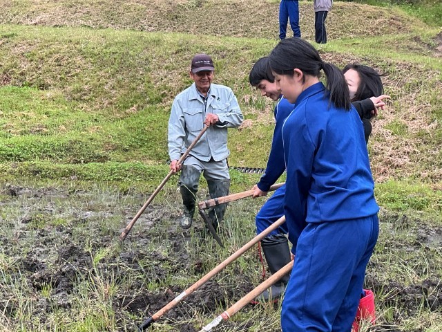 雨予報が出ていたので、予定を早めて朝一番に田起こしを行いました。校内整備員さんの助言を受け、鋤を田に打ち込みました。最初は慣れない道具を恐る恐る使用していましたが、「軽く打って引き起こすんだよ」「広い面積を起こすのだから、頑張りすぎないことがコツ」など長く経験してきた言葉に支えられ、田を一面、手だけで起こせました。