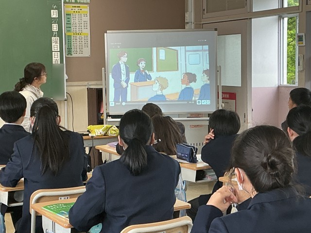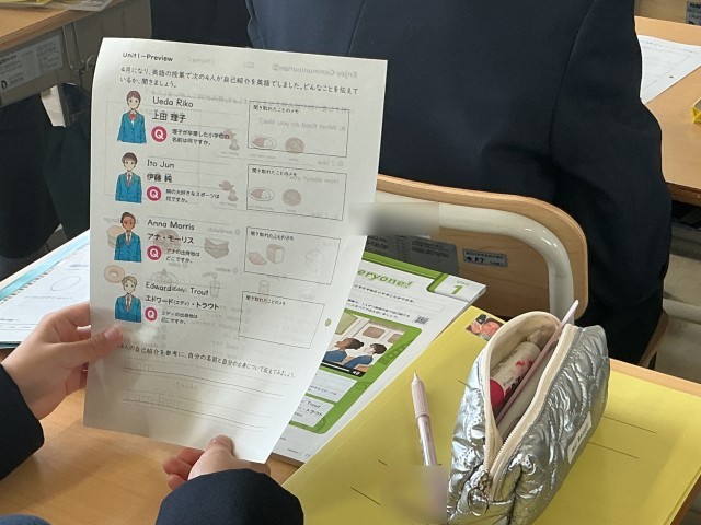 「Rock!Scissors!Paper!1、2、3!」1年生教室から賑やかなアクティビティーを行う声が響いてきます。小学校までに習った英単語を使った活動が行われていました。その声に誘われて教室に入ると、ちょうど教科書Unit①に入るタイミングでした。いよいよ中学校英語が始まります。最初は自己紹介から始まります。流れる映像の音声を聞き取って登場人物の紹介を聞き取っていました。小学校で学んだ基礎を伸ばしていきましょう。