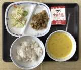 今日の献立は、麦ごはん、パンプキンポタージュ、チキンサラダ、きんぴらピラフ、牛乳...