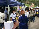 こちらは防災啓発展示、地域野菜販売、竹細工作品展示での様子です。 お客さんへの呼...