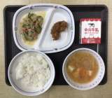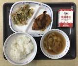 今日の献立は、ごはん、キムチスープ、中華サラダ、鶏肉の唐揚げ、牛乳、でした。エネ...