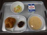 今日の献立は、キャロットポタージュ、コールスローサラダ、ハンバーグ、りんごパン、...