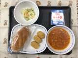 今日の献立は、ミネストローネ、コールスローサラダ、チキンナゲット、米粉パン、牛乳...