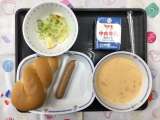 今日の献立は、キャロットポタージュ、リンゴサラダ、ウインナー、ツイストパン、牛乳...