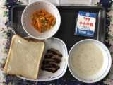 今日の献立は、ポタージュスープ、キャロットサラダ、ハンバーグサンド(中濃ソース(...