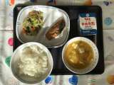 今日の献立は、冬至献立で、かぼちゃのみそ汁、白菜のごまあえ、ブリの柚子風味揚げ、...