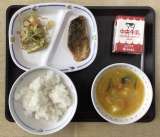 今日の献立は、「冬至献立」で、カボチャの味噌汁、白菜のゴマ和え、ブリの唐揚げ、牛...