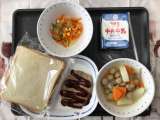 今日の献立は、根菜シャキシャキポトフ、キャロットサラダ、ハンバーグサンド(中濃ソ...