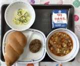 今日の献立は、鶏肉と野菜のうま煮、キャベツの昆布あえ、豆腐しんじょ、ごはん、牛乳...