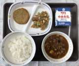 今日の献立は、ジャガイモのみそ汁、大豆のピリ辛炒め、はんぺん、ごはん、牛乳、でし...