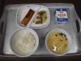 今日の献立は、サンラータン(たまご入り)、棒々鶏(バンバンジー)、春巻き、ごはん...