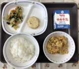 今日の献立は、親子煮、おひたし、豆腐しんじょ、ごはん、牛乳、でした。エネルギー:...