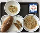 今日の献立は、炒めビーフン、ごぼうサラダ、餃子、ごはん、牛乳、でした。エネルギー...