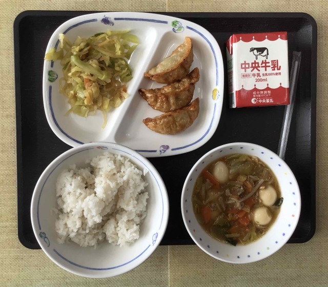今日の献立は、麦ご飯、中華飯、華風和え、揚げ餃子、牛乳、でした。エネルギー:83...