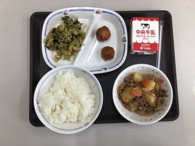 今日の献立は、ご飯、肉ジャガ、おかか和え、愛知のレンコン入りつくね、牛乳、でした...