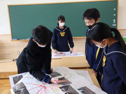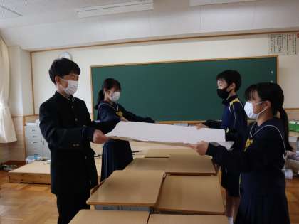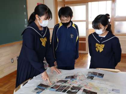 昨年度作成した、自転車通学のための地図とポスターを、1年生に渡しました。どこをどのように通行したらよいか、登校と下校、それぞれ詳しく調べたことを説明しました。