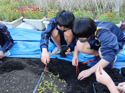 ボランティア部は、日頃の活動として、中庭や校内外の花壇の水やりなどのお手伝いをしています。