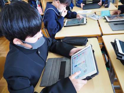 1年生の総合的な学習の時間では、学習用タブレットを使って今注目が集まっているSDGsについて調べています。17項目のゴールにはそれぞれどのようなものなのかスライドにまとめて、来週発表する予定です。