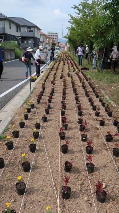 苗を均等に並べるだけでも一苦労でしたが、皆さん楽しそうに作業に取り組んでくださっているのが印象的でした。デザインもこだわっていただいたそうですから、中学校付近にお越しの際は、是非花壇をご覧ください。