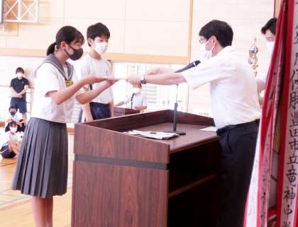19日(月)午後、3年生が夏休み前最後の学年集会を行いました。その中で、開始から多くの時間をかけて行われたのが、3年生の皆さんが4月から各種大会等で獲得した表彰の披露でした。多くの部活動のすばらしい成果を、学年全員の前で校長先生に紹介していただきました。披露が終わった後で、校長先生は、開校以来最も多くの成果を上げてくれました、と3年生の努力を称えました。上位大会に進んだ皆さんの更なる活躍を期待しています。