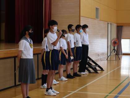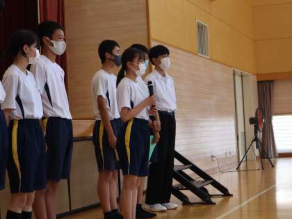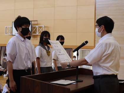 4月から各種大会等での活躍で獲得した表彰の披露を行いました。校長先生からは,この夏休みは,部活動で3年生から引き継ぎ様々な面で学校の中心となって活躍することや,充実した自然教室となることを期待しますと話していただきました。