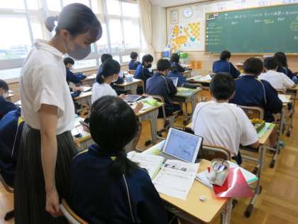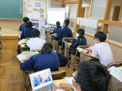社会科の先生は、全員に説明する時はホワイトボードに投影した資料を使い、子どもたち一人一人が資料を読み取ったり考えたりする時は、タブレットに映った資料を使うなどの工夫をしていました。また、タブレットを使うことで、子どもたちは資料を拡大して見たり、複数の資料を比較しながら見たりしていました。