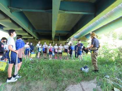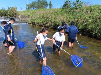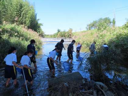 10月6日(水)に1年7組の子どもたちが、総合的な学習の時間の活動で伊保川の環境についての調査を行いました。豊田市役所環境政策課の方のご指導のもと、川に住んでいる水生生物を採取し、川に住んでいる生物の種類から、川の汚れ具合を考えました。今後はさらに川の水質についても調査を進め、川の環境問題について考えていく予定です。