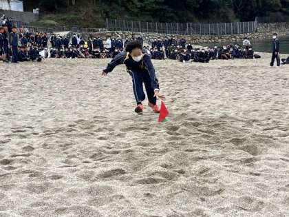 砂浜レクの2種目目はビーチフラッグです。クラス対抗で盛りあがっています。