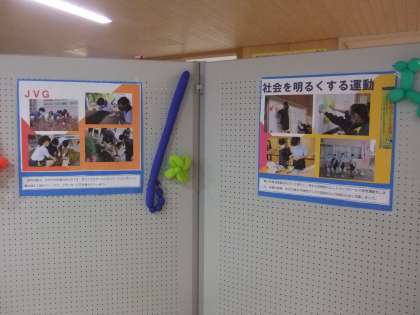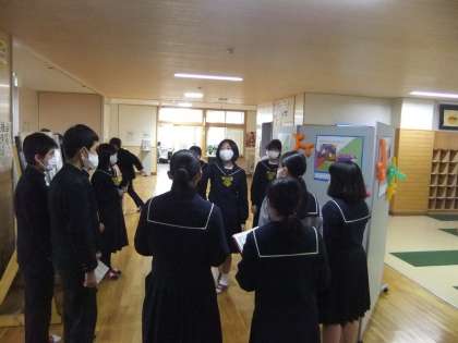 11月11日(木)の7限では、昇降口前にボランティア部の活動内容の展示コーナーを設置し、ボランティア部の子どもたちが参観に訪れた子どもたちに活動内容の説明をしました(写真)。また、美術部、家庭科部、科学・コンピュータ部の子どもたちの作品が展示されている2階の廊下には、参観に訪れた子どもたちが作品に見入っていました。また、中庭では、吹奏楽部の子どもたちが演奏をし、演奏を聴きに訪れた子どもたちに素敵な演奏を聴かせてくれました。