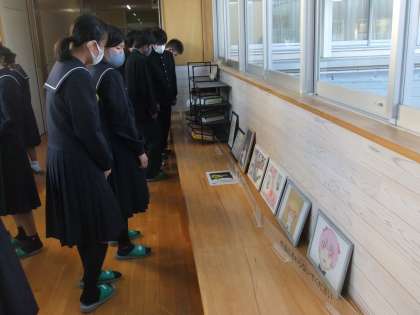 11月17日(水)7限での1年生の子どもたちの参観の様子と美術部や家庭部の子どもたちの作品の一部です。