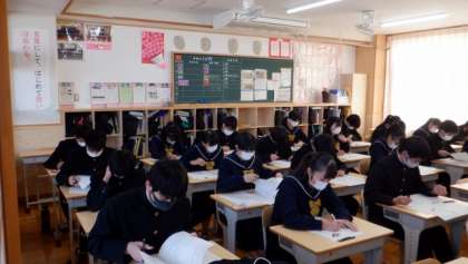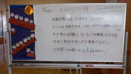 11月25日(木)から後期の中間テストが始まりました。1・2年生は2日間で5教科のテストを行い、3年生は3日間で9教科のテストを行います。子どもたちは最初の教科から気合を入れてテストに取り組んでいました。1・2年生は明日一日、3年生は後二日、最後の教科まで頑張ってほしいです。