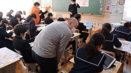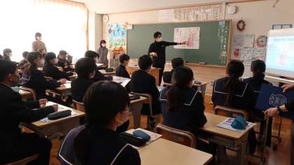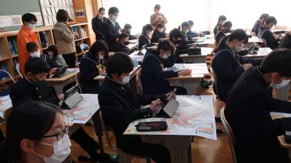 2日(木)5時間目に、1年2組で防災に関する学習を行いました。今回は講師として豊田市防災対策課の職員の方と愛知工業大学地域防災研究センターの皆さんをお招きして、浄水地区の地形の特徴や「洪水ハザードマップ」や「とよたiマップ」の見方を学びました。1年2組の生徒のみんなは、夏頃に急な雷雨で大変な被害にあったことや事前に学級で校外学習に出かけて危険個所を確認したことを思い出しながら、真剣に説明を聞いていました。3日(金)に、続きの授業を行う予定です。