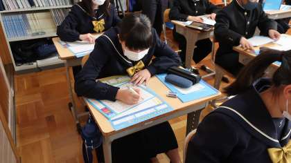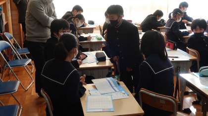 3日(金)6時間目に、前日に引き続き1年2組で防災に関する学習を行いました。この日も豊田市防災対策課の職員の方と愛知工業大学地域防災研究センターの皆さんに教えていただきました。今回は、豊田市が作成した「マイ・タイムライン(我が家の防災行動計画)」の活用方法を学び、実際に一人一人が作成に挑戦しました。「マイ・タイムライン」は風水害の備えを時系列で計画を立てるもので、水害や土砂災害の影響は少ない浄水地区ではありますが、台風や市に甚大な被害が出た場合の停電や断水への対策として役立つものです。1年2組の生徒のみんなは、自分のことだけでなく、家族や離れて暮らす祖父母や親戚、あるいは浄水地区に避難してくる人々のことを思い浮かべながら様々な考えを出し合っていました。中には市の職員や大学の方が感心するような意見も出てきて有意義な学習ができました。今回学んだ1年2組のみんなが家族や他の生徒、地域の人達に少しでも伝えられるといいですね。