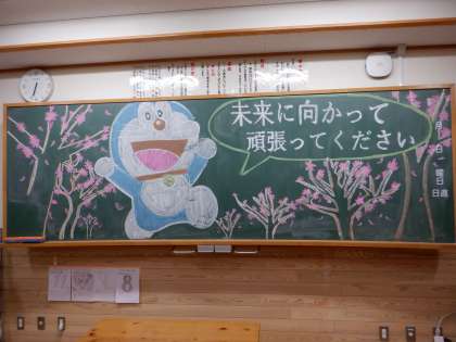 3年生を送る会に向けて、生徒会が中心となって、3年生への思いを1・2年生全員が寄せ書きとして贈りました。1・2年生の子どもたちの3年生への思いが詰まった寄せ書きに、3年生の子どもたちも見入っていました。また、3年生の各学級の黒板にも素敵な黒板アートの贈り物がありました。