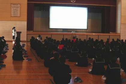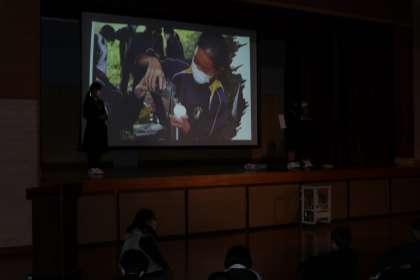 10日(木)午後、1年生が各学級で取り組んでいた学習の成果を発表する機会をもちました。1組と6組は地域の美化活動、2組は地域の防災、3組はSDGsを広める活動、4組は地域資源の有効活用、5組は服のリユース活動、7組は伊保川調査を行ってきて、それぞれの活動のねらいや活動のようすや成果をプレゼンテーション資料にまとめて分かりやすく発表していました。学習を通して、地域のことや社会、自然等について様々なことを知ると共に、話し合ったり、みんなで協力して作り上げたりといろいろな力を身につける機会になりました。