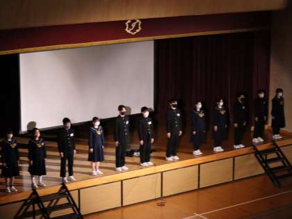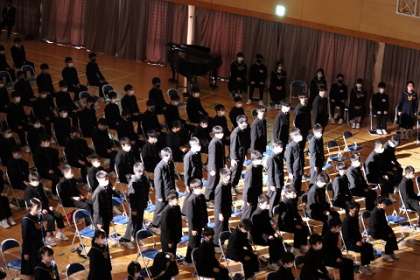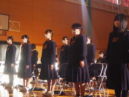 次に,小さい頃の写真の映像の視聴,実行委員による「私たちのあゆみ」の発表,1人1人の「立志の誓い」をしました。皆,自分の将来について真剣に考えてきたことを,堂々と発表することができました。今回は新型コロナウイルス感染症拡大防止の観点から,歌うことはできませんでしたが,代表生徒の伴奏に合わせて,これまでの取組の様子や歌詞を見ながら,心の中で「誓いの合唱」を歌いました。