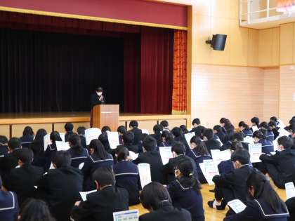 23日(水),進路指導主事の先生より,来年度の入試に向けての話をしていただきました。公立高校の入試制度のことや,進路目標実現に向けての心構えやこれからの予定の話を聞きました。初めての進路の話であり,皆,メモを取りながら,真剣に話を聞いていました。