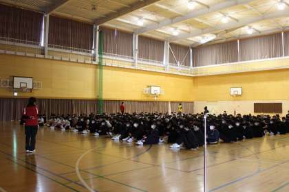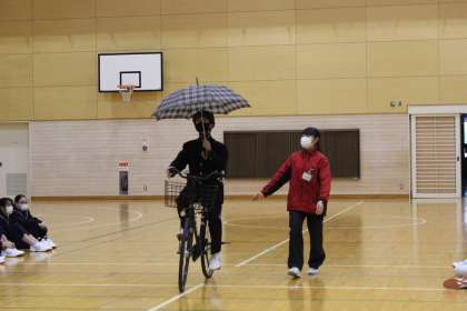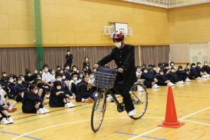 後半は代表生徒に実際に自転車に乗ってもらいながら、乗り方による危険性の高さを学ぶことができました。登下校や帰宅後の生活で自転車を利用している生徒が多いことから、大変有意義な時間となりました。