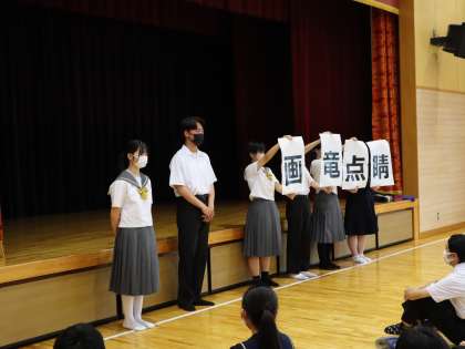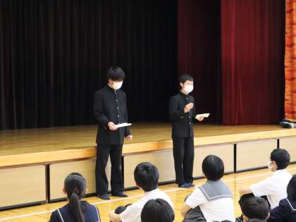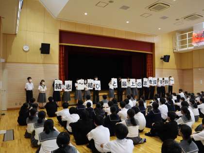 企画委員長・副委員長のあいさつ,企画委員会と修学旅行のスローガンの発表や修学旅行についての話を聞きました。