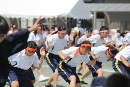 1年生は、学年の表現活動として、「ソーラン節」を行いました。練習から、実行委員が中心となり、動きを細かいところまで意識したり、掛け声では、一人一人が全力で取り組んだりする姿がありました。本日の本番で見せた1年生のソーラン節は、これまでの練習の成果を発揮し、見ている人に感動を与えるものになったように思います。