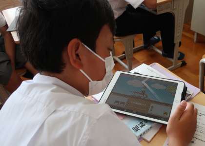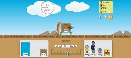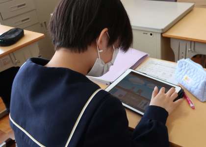 授業では様々な機会に学習用タブレットを活用しています。今回は3年生の理科の授業での活用場面を紹介します。「力と運動」という内容のまとめの段階で、タブレットでシミュレーション実験を行って確かめました。実際の実験も行っていますが、条件を手軽に変えて繰り返し結果を確かめることができるので、理解を深める助けになります。生徒は興味深く学習内容の確認に取り組んでいました。