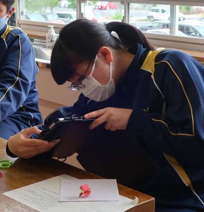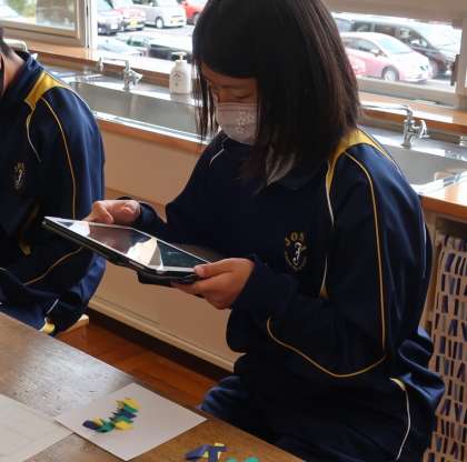 10日(金)に行われた2年生の美術の授業の様子です。視点の違いに着目した表現活動を学習していました。まずは色画用紙を組み合わせて立体的な構造物をつくり、学習用タブレットのカメラ機能を使って、異なる視点で撮影をしていました。教室内ではタブレットを様々な角度に構え、画面に映る構造物とにらめっこをしている生徒の姿が見られ、タブレットならではの風景でした。文科省や市教委が掲げているICTを活用した個別最適な学びを今後も実践していきます。