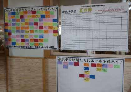今年度も新型コロナウイルス感染症対策により、各会場は入場規制が行われるため、直接応援することが難しい状況です。そこで、生徒会執行部が昼の放送で各部の意気込みなどを紹介したり、昇降口に応援メッセージを掲示したりして、選手と応援する人、それぞれの思いを伝え合う工夫をしています。選手の皆さん、気持ちを盛り上げて頑張ってきてください。