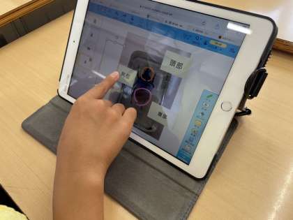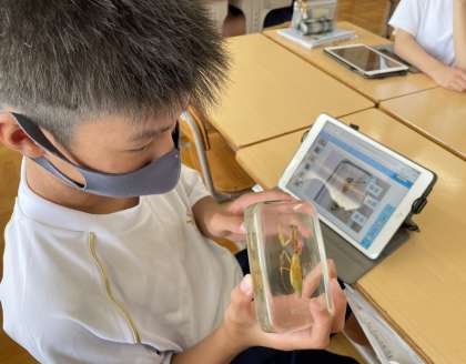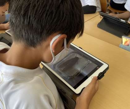 豊田市郷土資料館より、樹脂で固めた昆虫の標本をお借りして、1年生の理科の授業で、昆虫の体のつくりについて観察を行いました。一般的な標本と異なり、透明な樹脂の中に固定した昆虫は、どの角度からも観察が可能で、昆虫を触れるのが苦手な生徒もじっくりと観察することができました。また、タブレットのカメラ機能で昆虫の体の様子を撮影し、タブレットの画面上に気づいたことを記入する等、実物とデジタル画像の両面で丁寧な観察ができました。