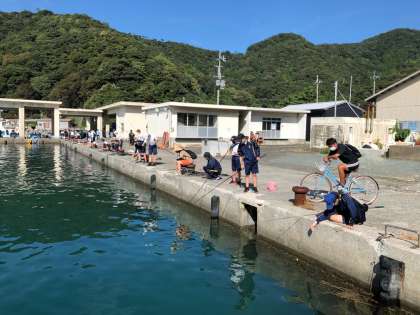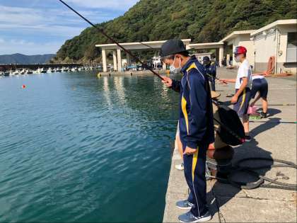 漁港で釣りの体験を行なっています。今日はなぜかフグの子どもが大量にいて、入れ食い状態ですが生徒たちは大声を上げながら楽しんでいます。