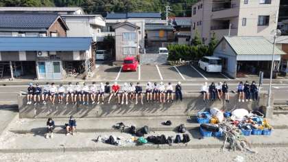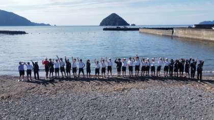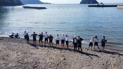 海水浴場で、学級の活動を行いながら記念撮影です。